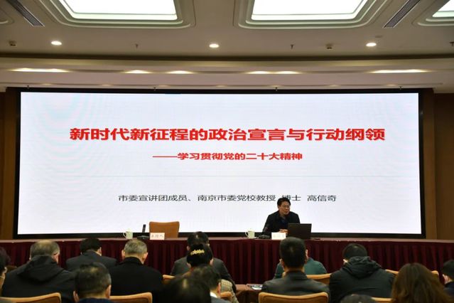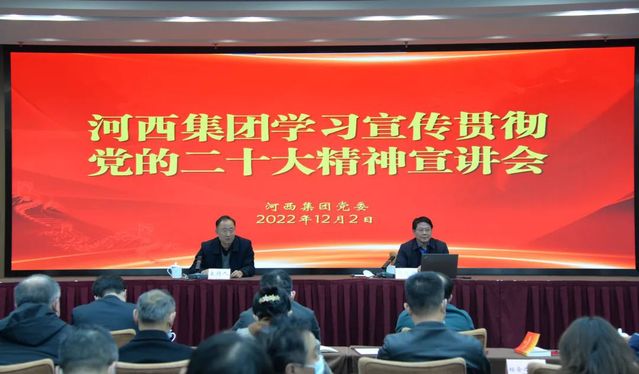 根據(jù)中央和省市委、市國資委黨委部署要求,12月2日下午,河西集團召開學(xué)習(xí)宣傳貫徹黨的二十大精神宣講會,邀請市委宣講團成員、市委黨校科研處處長高信奇教授做專題宣講,進一步引導(dǎo)集團廣大黨員干部職工全面深入學(xué)習(xí)宣傳貫徹黨的二十大精神,切實把思想和行動統(tǒng)一到黨的二十大精神上來,更加深刻領(lǐng)悟“兩個確立”的決定性意義,不斷增強“四個意識”、堅定“四個自信”、做到“兩個維護”。會議由集團黨委副書記、董事繆昌根主持。集團領(lǐng)導(dǎo)、全體中層干部及集團下屬各公司黨務(wù)工作者參加會議。