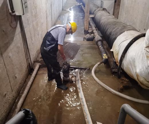 管廊處于地下五米,內(nèi)部干燥悶熱。此次檢修因在一平方米左右的受限空間內(nèi)操作,且蓄水池內(nèi)積水較多,無法下池檢修水泵具體的故障原因,工程人員立即采取措施接通備用水泵連接水帶,先將積水排出,并清理蓄水池里的垃圾。狹窄的蓄水池內(nèi)彌漫著異味,池內(nèi)能見度幾乎為零。幾經(jīng)探查,成功排查出止回閥已損壞。工作人員查明故障原因后,第一時(shí)間制定檢修方案,順利完成了搶修,此時(shí)汗水已經(jīng)完全濕透了他們的工作服。