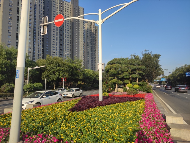 水韻路中分帶的花球也換上了新裝,10個(gè)巨大的牽?;ㄇ虮患t黃色的花帶簇?fù)碇谔栂卤M情地綻放著,像是小孩的笑臉,歡快地為祖國母親慶生。