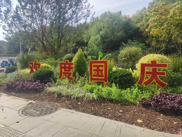 樂山路和夢都大街的東南角節(jié)點(diǎn)是新增加的花境景觀,使用了完美冬青、迷迭香、金葉蕕等二十多個(gè)草花品種,錯(cuò)落有致的草花搭配和花境中豎起的“歡度國慶”標(biāo)語牌,烘托出熱烈的節(jié)日氣氛。