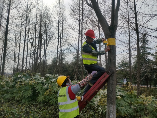 這項(xiàng)舉措不僅可以大大降低綠化養(yǎng)護(hù)成本,并且還不存在農(nóng)藥殘留,不污染環(huán)境。目前公司綠化養(yǎng)護(hù)人員已經(jīng)對(duì)嗇園路83株欒樹、蒼山路的20余株紫葉李進(jìn)行了膠帶黏蟲實(shí)驗(yàn),后期公司將持續(xù)進(jìn)行觀察,來(lái)檢驗(yàn)其防治效果,為后期開展病蟲害防治提供寶貴的科學(xué)依據(jù)。