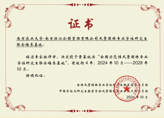 近日,全國風景園林專業(yè)學位研究生教育指導委員會正式公布了2024年“全國示范性風景園林專業(yè)學位研究生聯(lián)合培養(yǎng)基地”名單。南京濱江公園管理有限公司與南京農(nóng)業(yè)大學合作共建的“南京農(nóng)業(yè)大學—南京濱江公園管理有限公司風景園林專業(yè)學位研究生聯(lián)合培養(yǎng)基地”,憑借卓越的聯(lián)合培養(yǎng)成效和深厚的校企合作基礎,再次獲此資質。