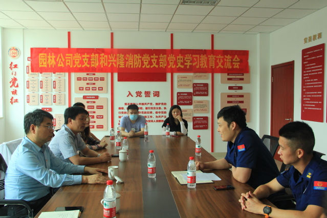 首先開始的是黨史學習教育交流會,雙方就黨建品牌培育工作進行了交流,興隆消防黨支部在建鄴消防救援大隊“紅門黨旗紅”黨建品牌建設牽引下,強堡壘、抓作風、帶隊伍,保障了中心任務。園林公司黨支部以“鑄紅心·享園林”黨建品牌建設為牽引,凝聚思想、開拓創新,推動公司高質量發展。之后,雙方就黨史學習教育開展情況進行了交流,并提出要進一步發揮雙方優勢和特長,加強交流與協作,雙向促進、共同提高。