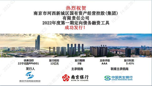 3月9日,南京市河西新城區(qū)國(guó)有資產(chǎn)經(jīng)營(yíng)控股(集團(tuán))有限責(zé)任公司(以下簡(jiǎn)稱“河西集團(tuán)”)成功發(fā)行2022年度第一期定向債務(wù)融資工具。