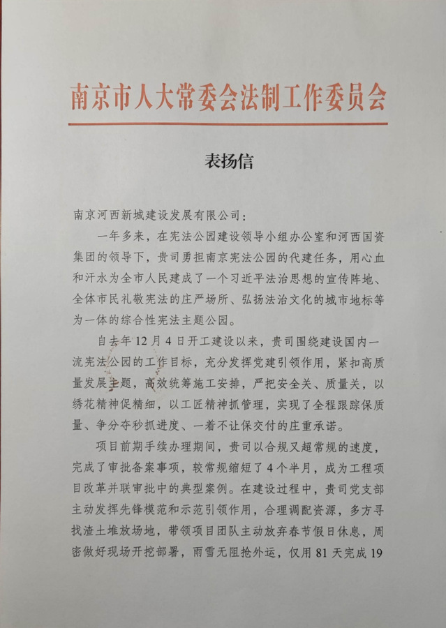 近日,河西集團新城公司收到南京市人大常委會法制工作委員會表揚信,信中對新城公司順利履約憲法公園項目代建任務(wù)表示了肯定與感謝。