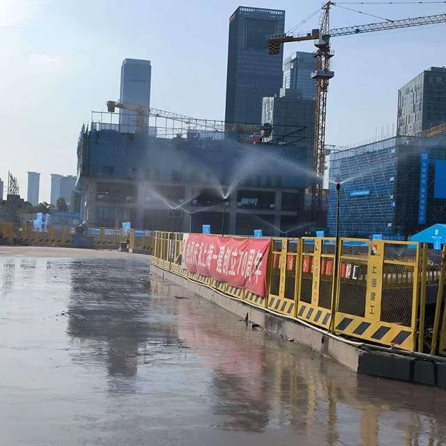 該項目A、B、C區(qū)目前處于底板施工階段,針對揚塵管控,新城公司項目管理團(tuán)隊嚴(yán)格按照“十達(dá)標(biāo)”管理標(biāo)準(zhǔn)進(jìn)行施工,在出入口規(guī)范設(shè)置沖洗平臺,并配合高壓水槍等設(shè)備對進(jìn)出車輛進(jìn)行全方位沖洗,杜絕了車輛帶泥上路。施工現(xiàn)場配備霧炮機、高桿噴淋進(jìn)行360°旋轉(zhuǎn)降塵。同時,項目安排專人對施工道路進(jìn)行清掃,灑水車不間斷灑水使道路保持濕潤,進(jìn)一步提升工地抑塵效果。